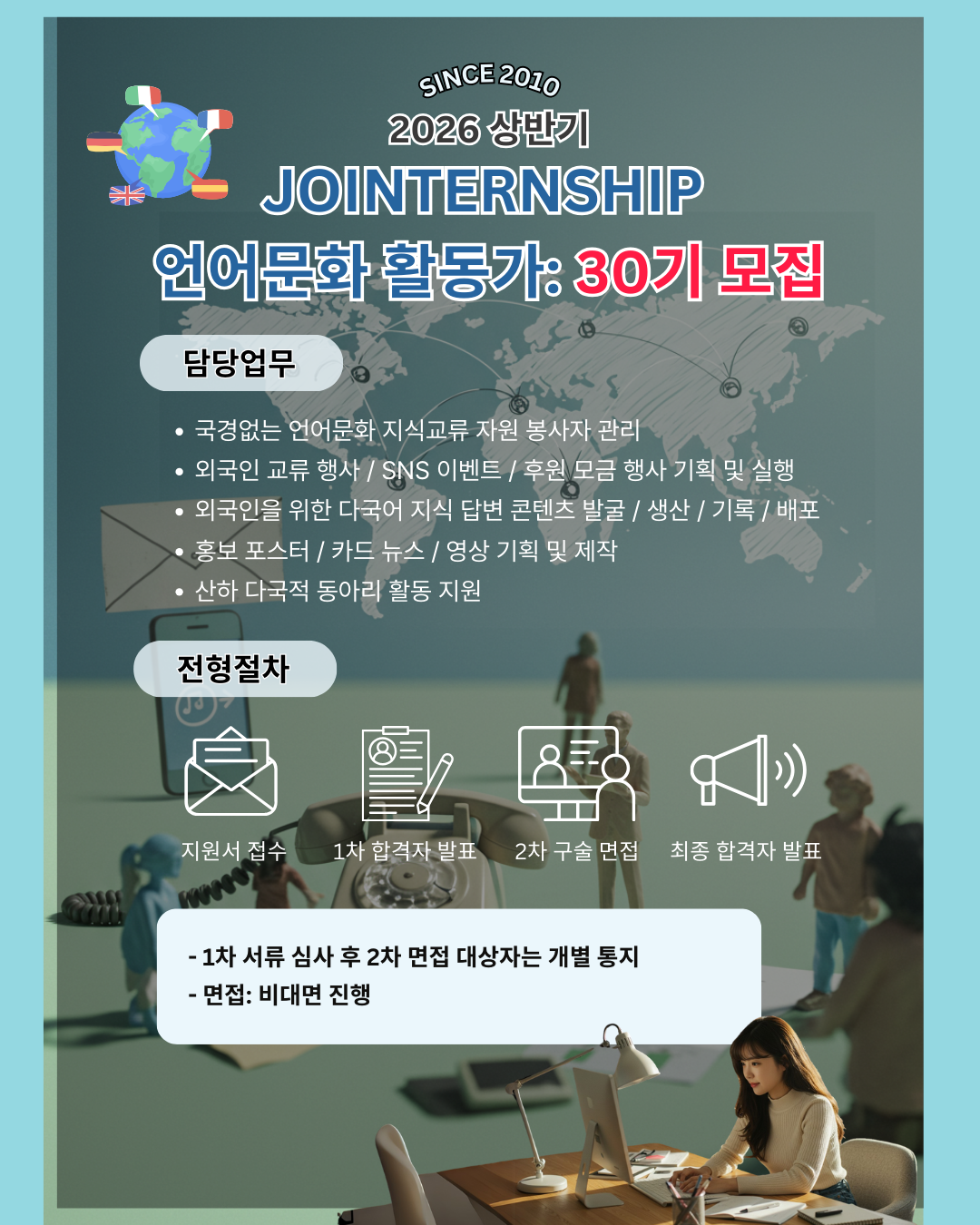 국제적 감각을 키우고, 다양한 언어와 문화를 잇는 30기 JOINTERNSHIP 활동가로 함께해 주세요.